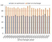 Percentage of SCIs by ASIA at admission and discharge (by year)